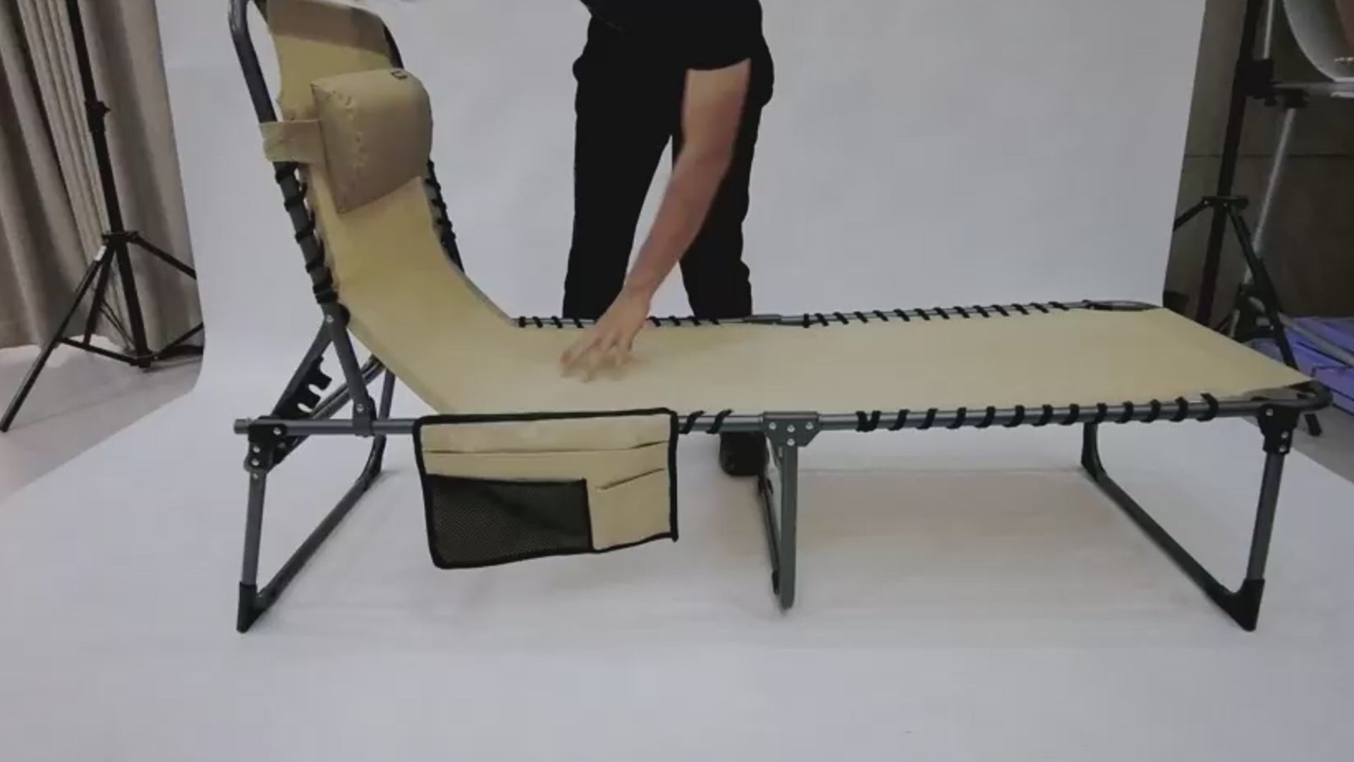 弾性バンドで上下調整できるクッション枕が、首や頭部をやさしく支えます。体型に合わせて位置を変えられるため、より自然な姿勢でリラックスできます。サイドポケットにはスマートフォンや水筒、小物類をすっきり収納可能。取り外しできる設計で、お手入れや位置調整も簡単です。